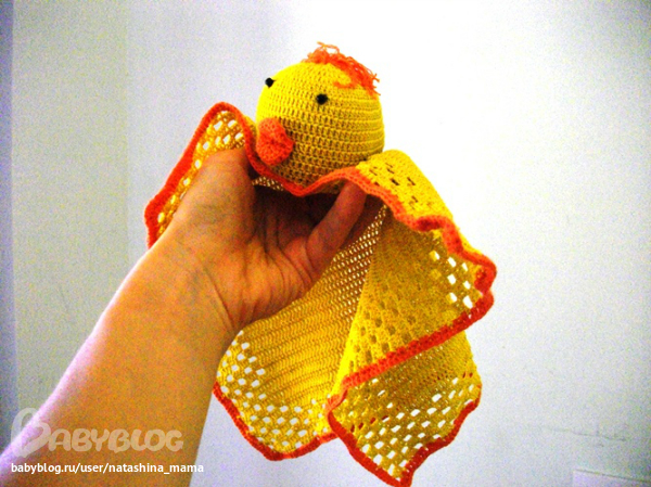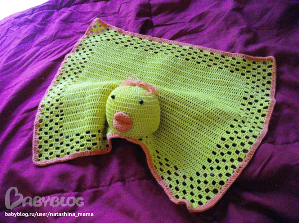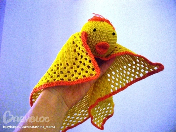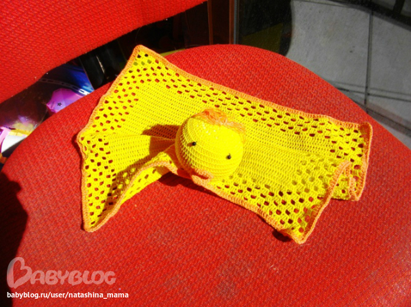 Не пугайтесь сразу)))) Это доченька мне заказала из мультика "Armadio di Chloe", как перевести-то поприличней...))) "Шкафчик Хлои". там есть такое одеялко-уточка, которое в воображении Хлои оживает и сопровождает ее во всех ее приключениях. Не знаю, если в России есть такой мультик, но у нас детки oт него без ума))) Вот, пара вечеров - и доченька довольна)))) Сегодня днем соседская девочка ревела белугой - тоже хочет Синьора Копертино)))) Боюсь, придется второго вязать))))))