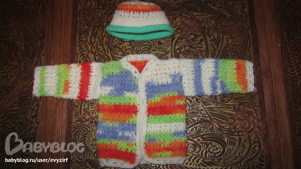 У шапочки кантик зеленый надо и на кофте повторить, например пумпончик какой-нибудь. А на шапке из остатка тех ниток что на каофточке использовались, а на шапке нет.А ваще клево)))
