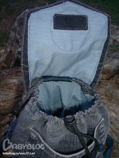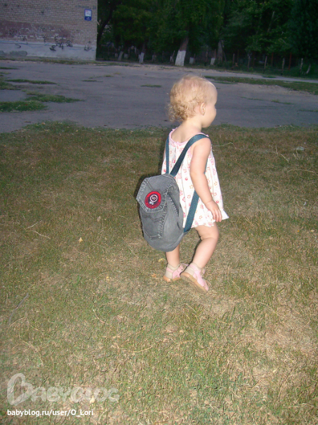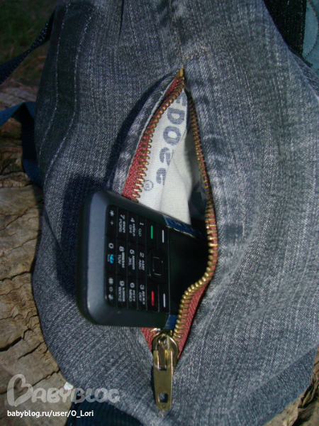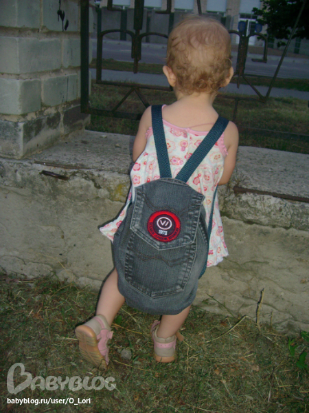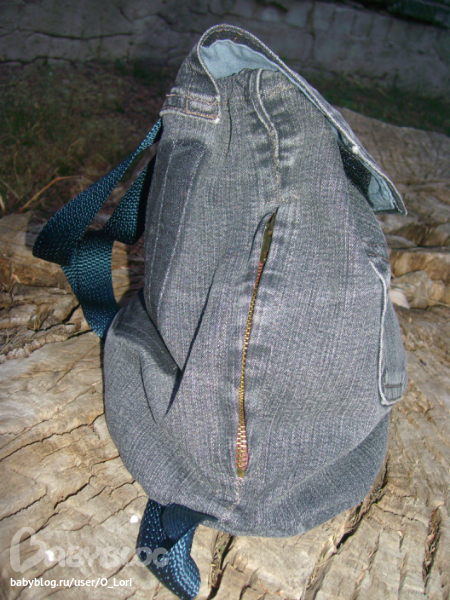 Пошился быстро - за полдня. Из старых папиных джинсов, на х/б подкладке. Одно большое отделение затягивается кулиской и застегивается на липучку (клапан рюкзака сделан из заднего кармана). Один внешний карман (бывший задний карман джинсов) и один маленький внутренний кармашек для мобилки.
