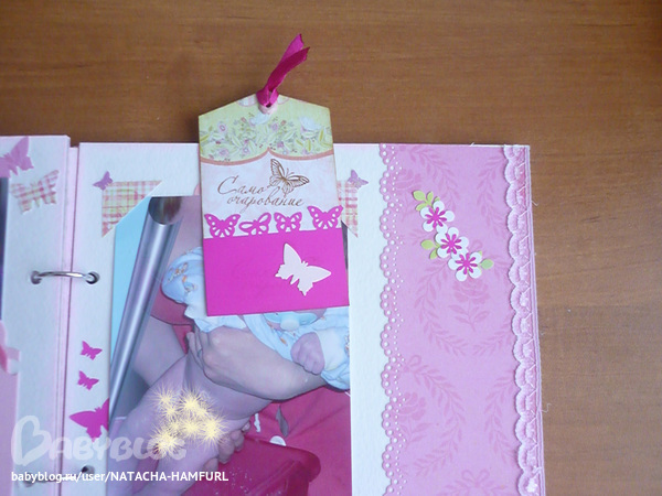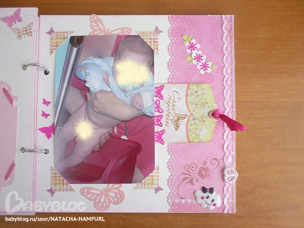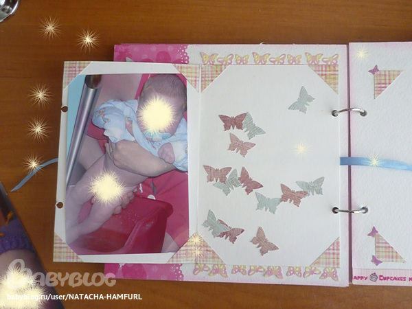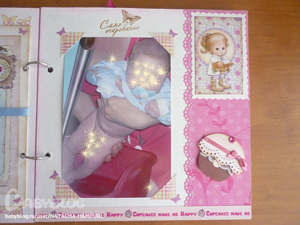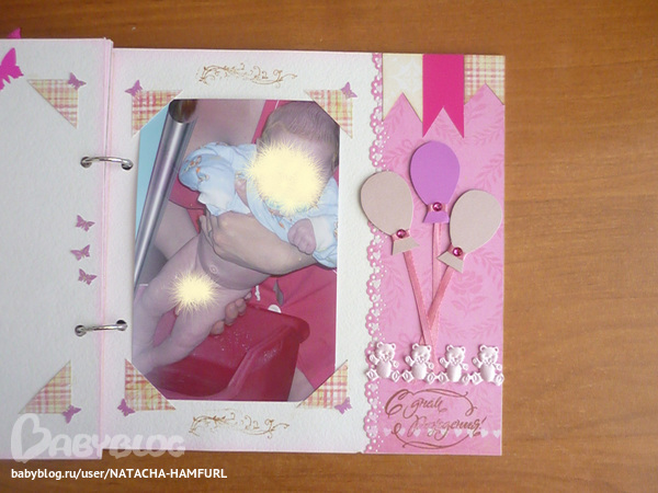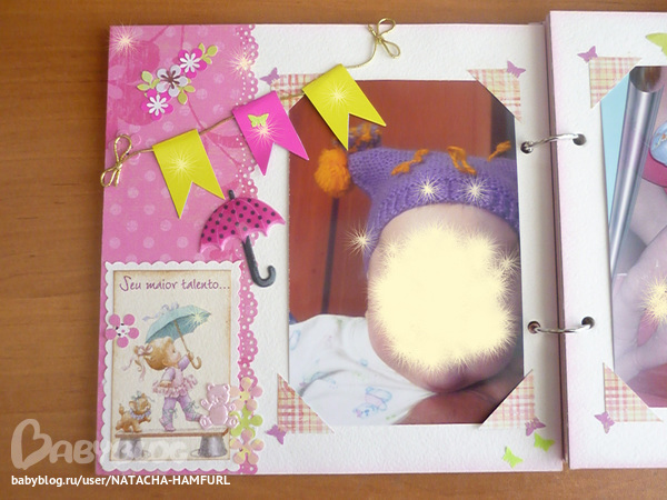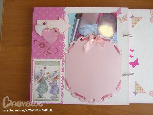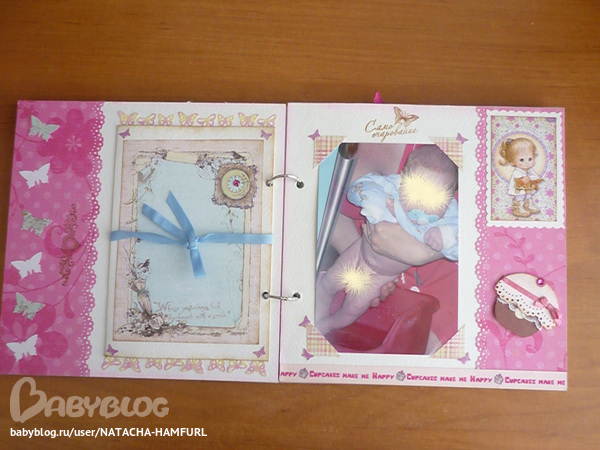 СкрапбукингТак я вдохновилась альбомчиками, что решила сделать ещё один. Этот для доченьки моей лучшей подруги. При фотосессии работала с двумя фотками своего сыночка, поэтому фотографии одинаковые. Смотрим... На 1 фото вставила картику с куколкой, что бы пусто не было. На самом деле в окошке будет фото малышки.