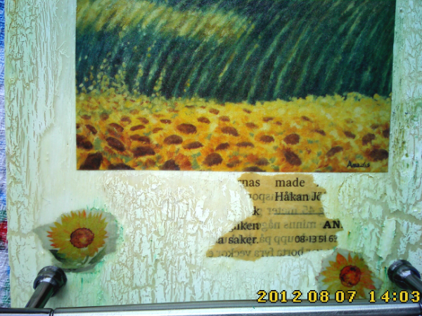 Действительно, обрывки газет и цветочки смотрятся как непонятные прилепышки, но думаю, если их и края основной картинки покрыть такой же основой с кракелюром, как на основном фоне, то будет смотреться гораздо мягче. Края основной картинки не обязательн оделать ровными, можно "заштриховать" свободными мазками, как будто эта картина - фреска, которая была найдена под слоем старой штукатурки...