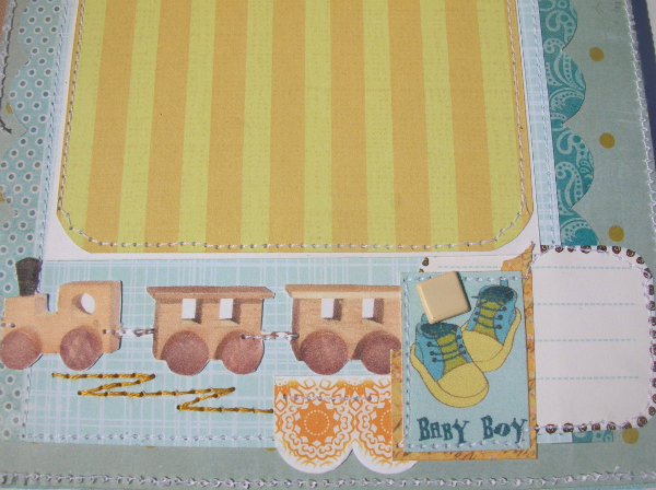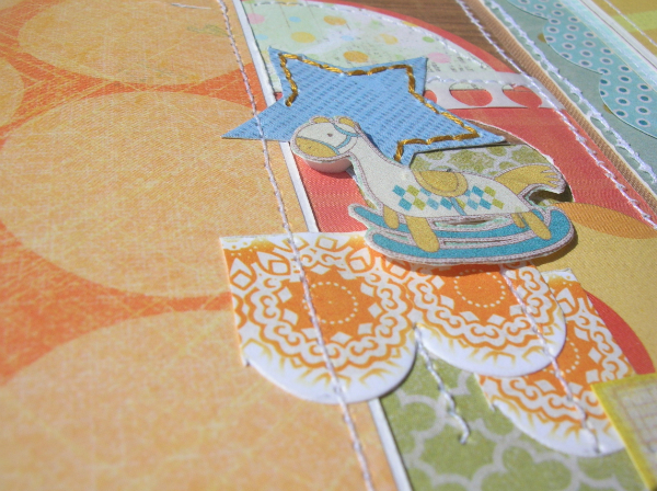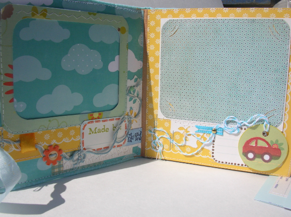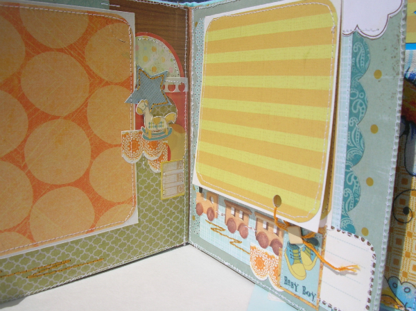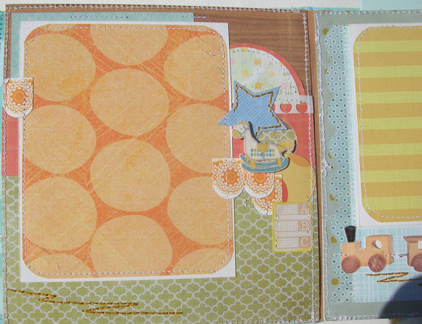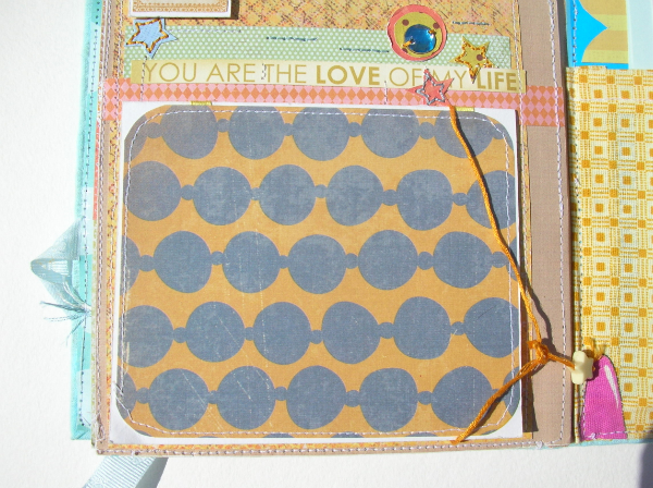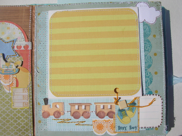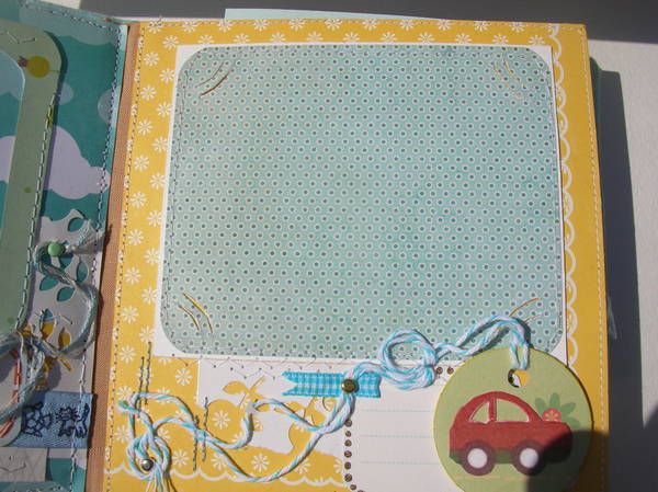 Получился альбом размером 15*15 и на 8 страниц. Давно хотела поработать с таким форматом, но теперь поняла, что для меня это очень маленький формат, долго думала что и куда пришить, поэтому и альбомчик вышел сдержанный, хотя и яркий ) Альбом рассчитан на 9 фото, есть тканевый кармашек (куда я спрятала подложки для фото с графиками роста, веса и успехов малыша).