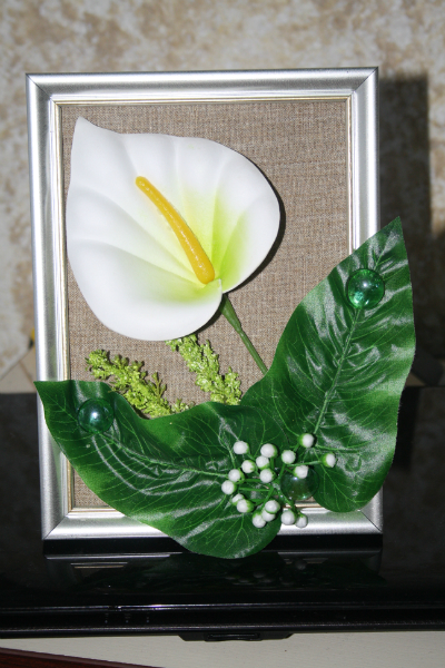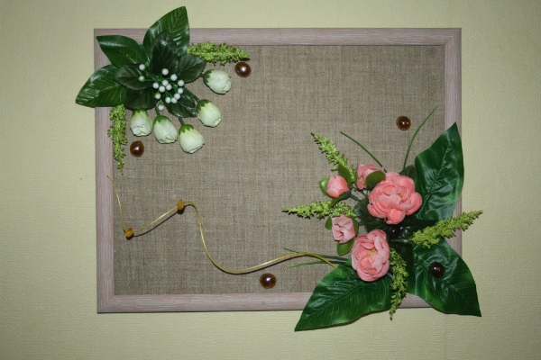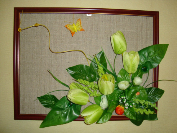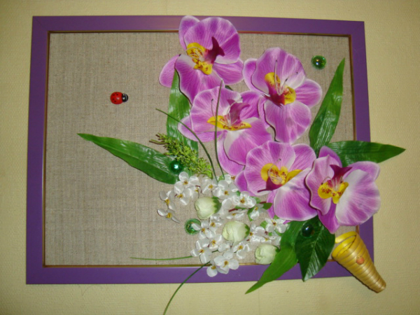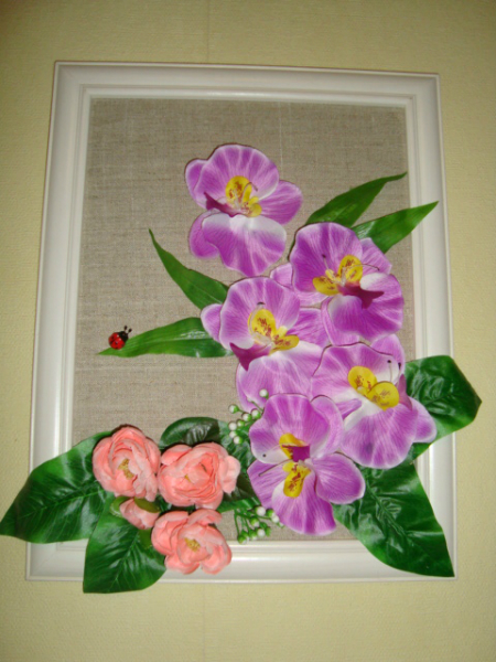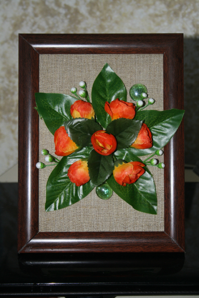 ткань - обыкновенный лен, необработанный, неотбеленный, некрашенный. Выглажен и все. Клеила по основанию подклада рамы (убирала стекло, а за ним есть картон, вот на него наклеивала основу на термопистолет), потом держатель для петель, потом раму, а потом композицию. вот и все )))))))))