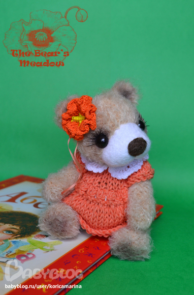 Связана мишка из фактурной пряжи, наполнитель синтепон, в попке стеклогранулят, ручки/ножки/голова подвижны, 5-шплинтовое крепление., реснички, глазки, мордочка привалена шерстью и тонирована пастелью, платьице из хлопка, воротничок из ириса, для головного аксессуара использовались хлопок, бисер, шёлковая ленточка, росточком от головы до пяточек около 16 см, не хочет стоять)))