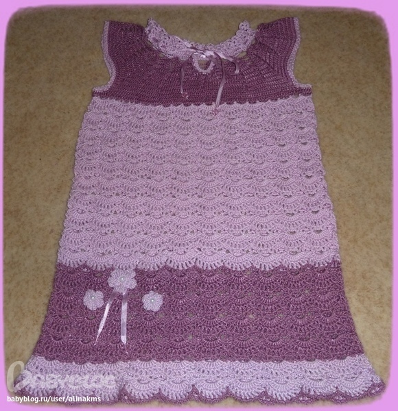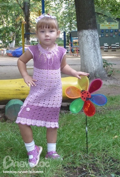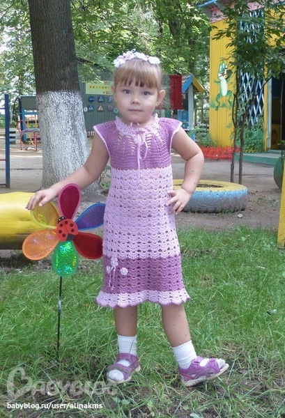 Это платье связала дочке еще в начале лета. Как говорится:"Я его слепила из того, что было." Результат нравится и мне и ей. Носит с большим удовольствием.