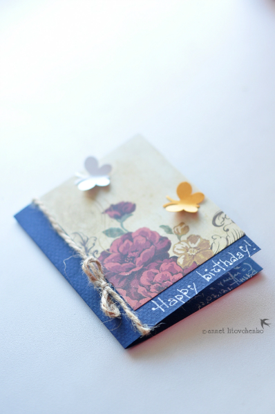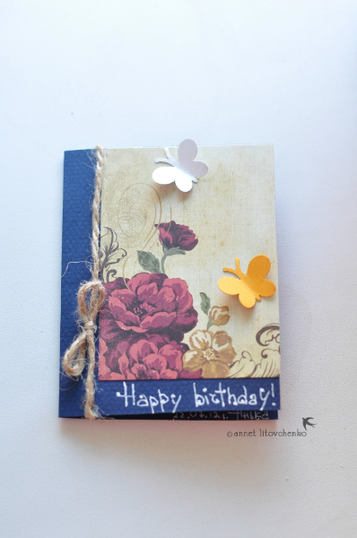 Но тем не менее простую открытку, построенную на совместимости цветов и элементов, захотелось сделать для хорошей девочки. И пусть бабочки приносят все самое хорошее и волшебное)