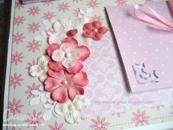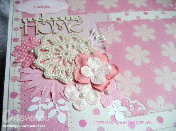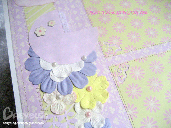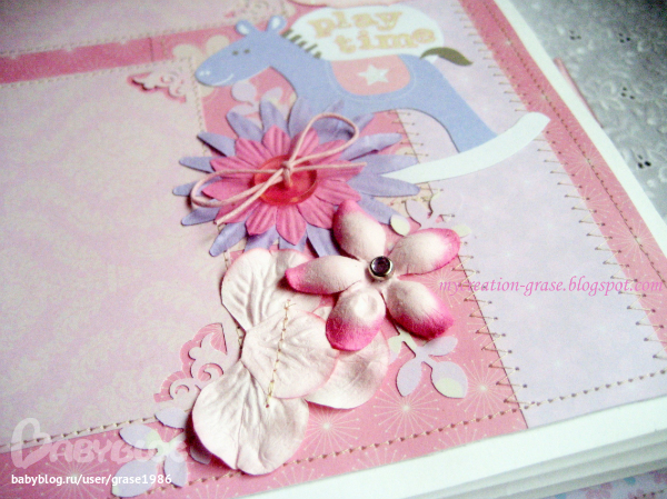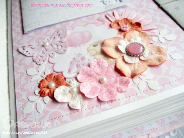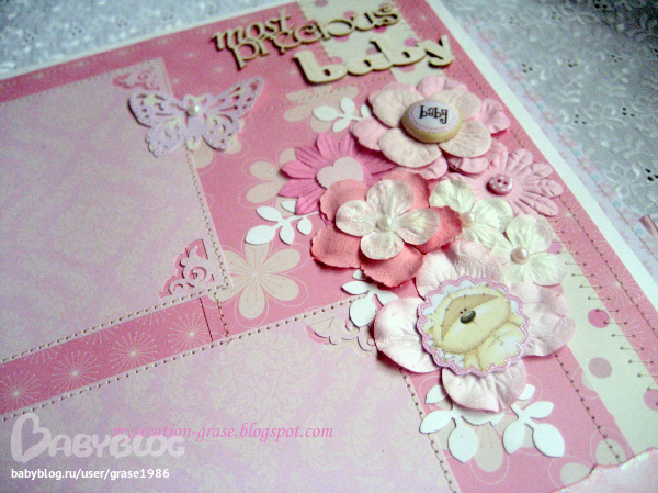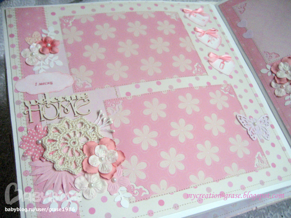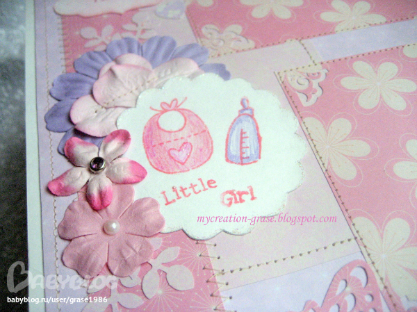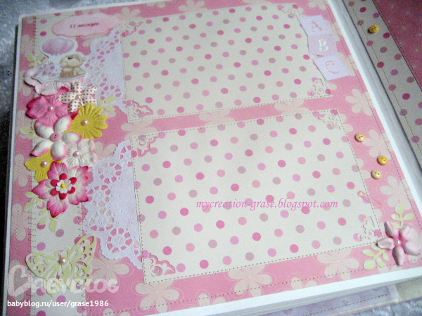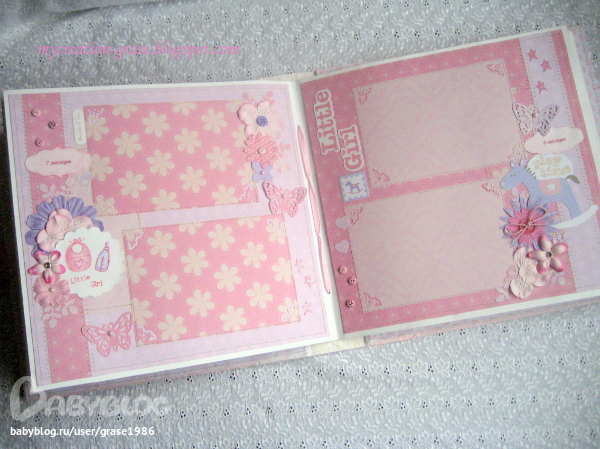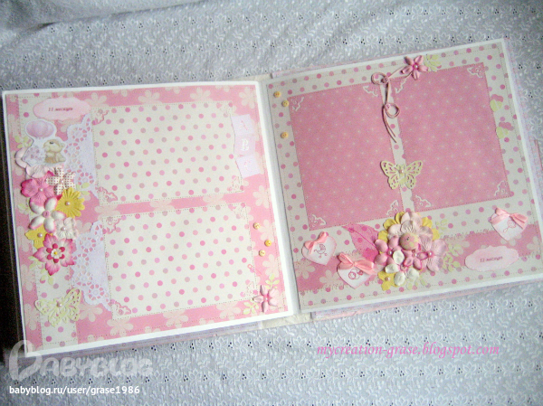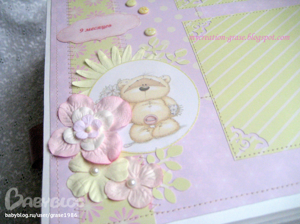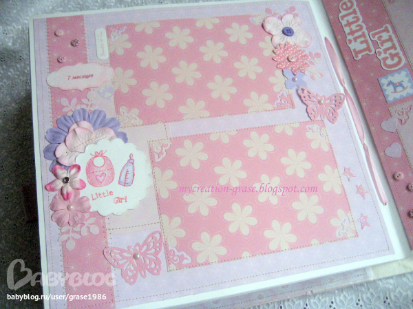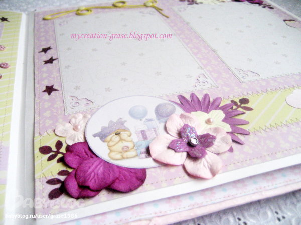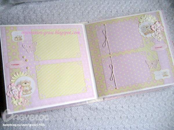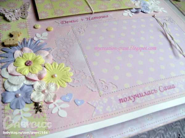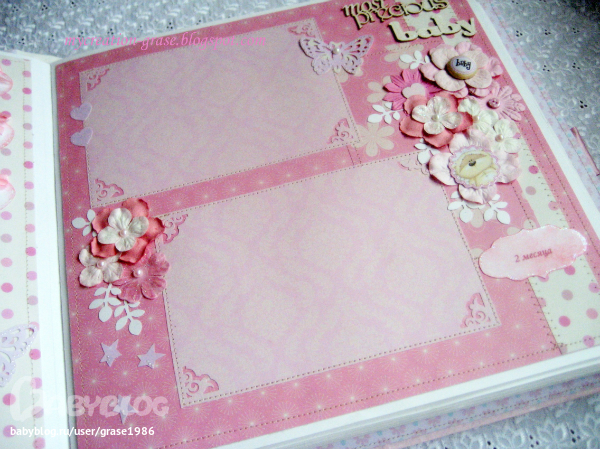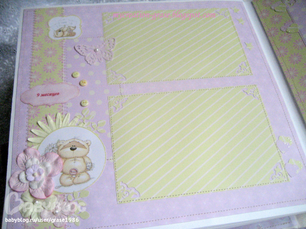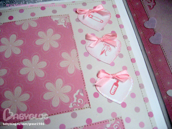 Здесь украсила страничку сердечками с отштампованными малышковыми мотивами, по краю глиттер на клеевой основе