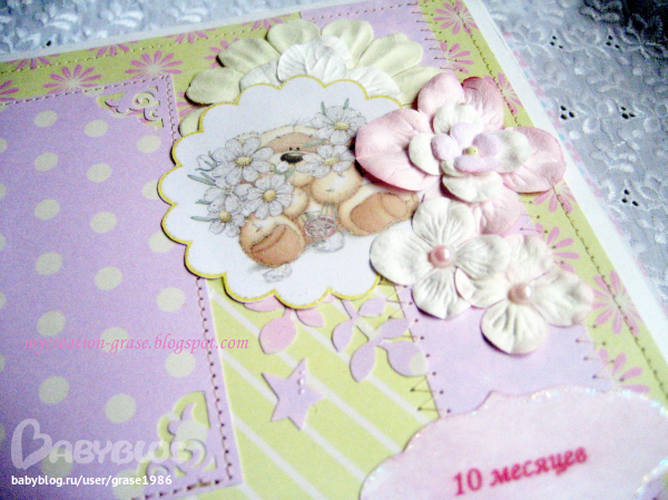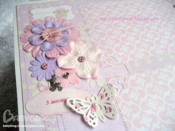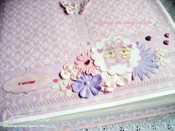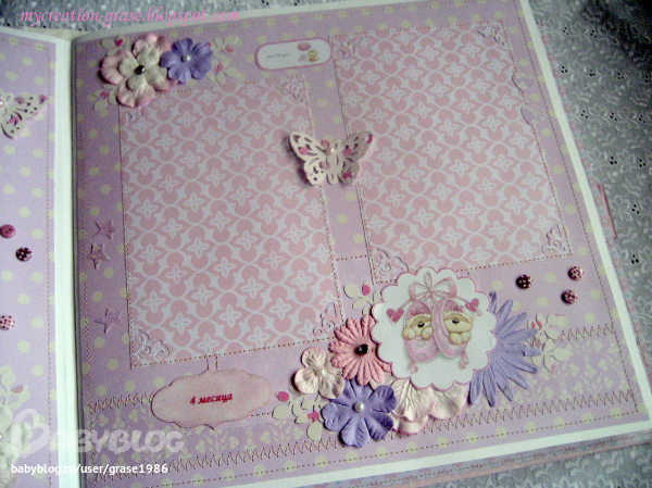 Разворотик про третий и четвертый месяцы. Постаралась использовать в альбоме и малышковые штампы и немного милых FizzyMoon-чиков, которые тоже понравились маме малышки
