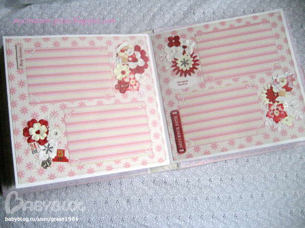 Разворотик про первый Новый год малышки получился в красно-белых тонах и тоже с мишками, которые дарят всем подарки))))