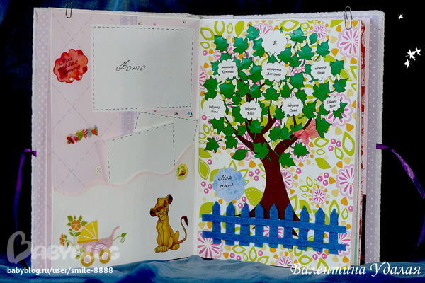 разворот №3 "Первые фото малышки" и "Моя семья". Страничка справа моя самая любимая. Каждый листик на деревце вырезан вручную. Заборчик из фетра.