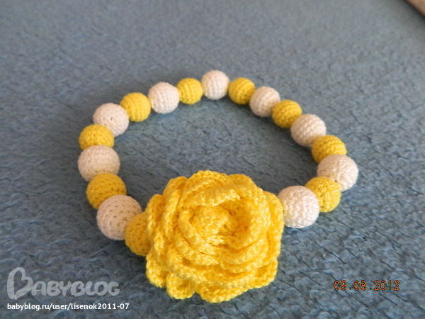 Бижутерия для слингомам. Слингобусы. Грызунки.Такие радостно желтые получись))) Прямо не могу, как веет от них позитивчиком))) Это стоечка ( туго вокруг шеи), бусины нанизаны на нитку резинку. Розочку первый раз вязала, чуть пальцы не сломала)))) Кстати, в этот раз попробовала при обвязывании бусин не просто пропускать петлю, а по науке убавлять (провязывать) - мороки больше, а результат не сильно отличается...
