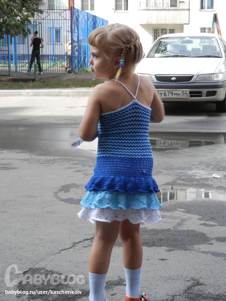 Начанала вязать себе платье (начала снизу), но чего-то не понравилось, может цвет, а тут еще и крестины в срочном порядке.... вообщем ВУАЛЯ платье превращается в сарафан. Пришлось довязать только кокетку!