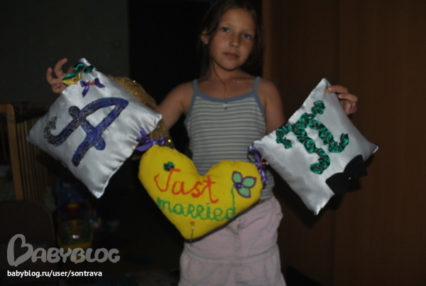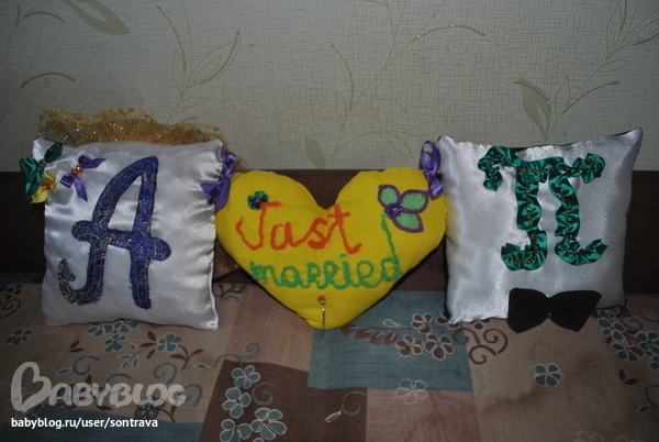 Шитье одежды, выкройки, ремонт одежды, шторы, швейные машины (уже приобретенные)Вот осенило и начала шить подруге на свадьбу подушки с первыми буквами их имен. Так как свадьба декорируется зелено-оранжево-фиолетовыми украшениями, я тоже старалась придерживаться этой цветовой гаммы помимо основных "свадебных" оттенков. Оцените, конструктивную критику приветствую.