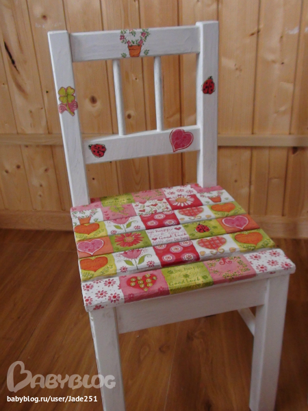 ДекупажПокупали мы в прошлом году стульчики Икея,вот только дочка их активно разрисовала фломастерами)) Долго я собиралась привести их в порядок и наконец сделала ЭТО!!!)))