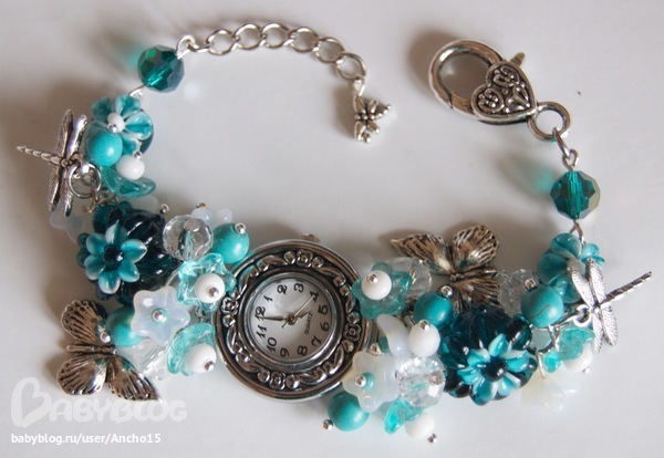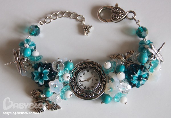 Часики выполнены из кварцевой часовой основы, бусин lampwork, бирюзы, гранёных бусин, чешского стекла и фурнитуры под серебро.