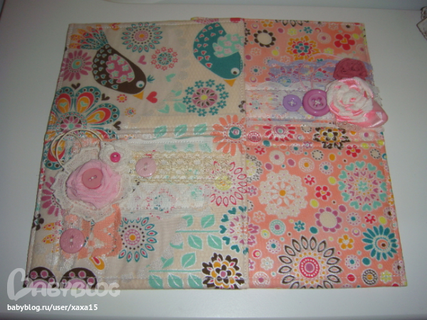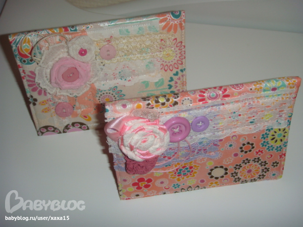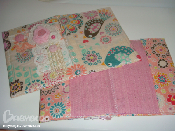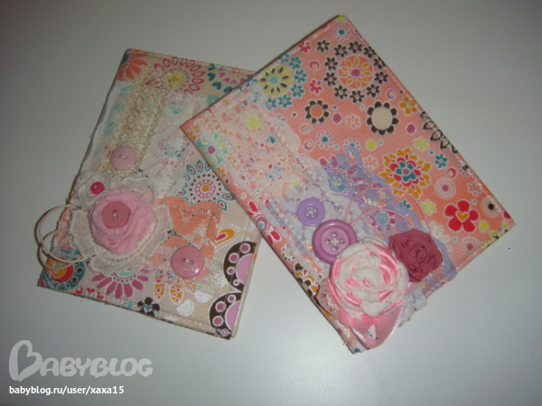 Шились на заказ две обложки на загран и российский паспорта. Просили меня сшить такие, которые можно было бы стирать... Так что все прошито и декор тоже:) Совершенно случайно:) у меня оказалось две расцветки тканей из одной коллекции, вот они то и пошли в дело! Американский хлопок, кружево, тесьма, пуговички, вощеный шнур, лён. Внутри прокладки из синтепона и фланели.