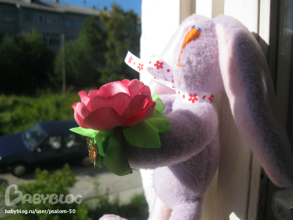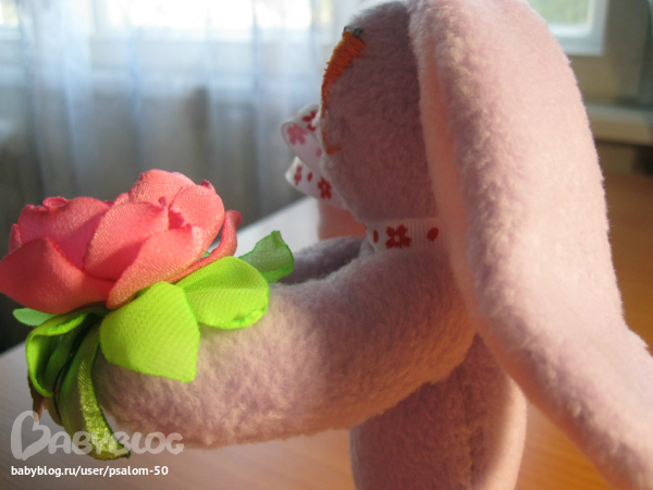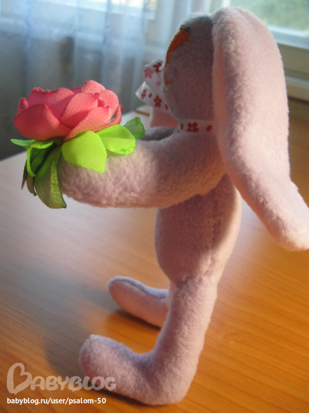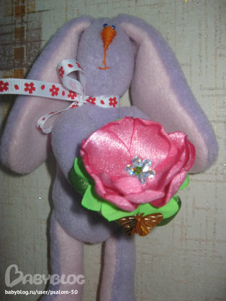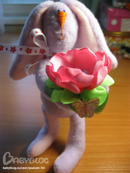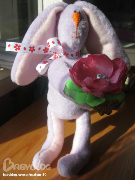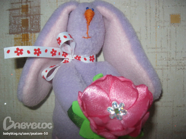 Сшился вот такой флисовый зайчик,рост 23 см,Тимоша увидел его сказал,мама-морковка!!!Нос вышила морковкой:).Он стал моим украшение рабочего стола.:))