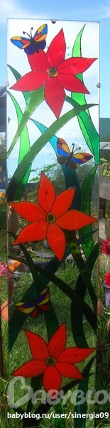 У свекрови в деревне на чердаке нашла боковые зеркала от старого трельяжа, решила попробовать витраж на зеркале. Это оказалось проще, чем их потом сфотографировать. Таскалась с ними по всей даче.Ничего не могла придумать кроме улицы, там хоть дачная зелень отражается.