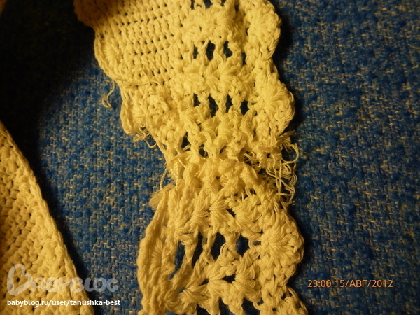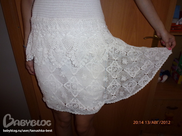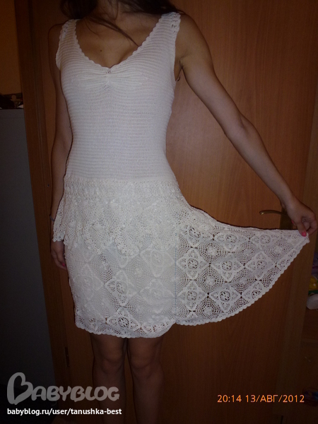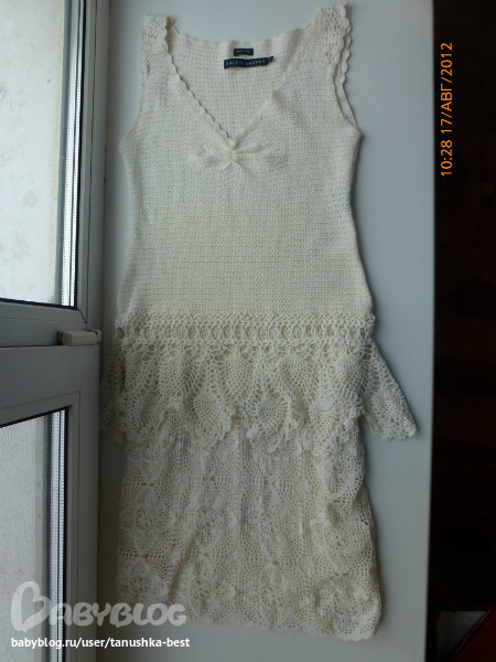 поступил мне заказик, переделать платье Ральф Лоурен, я решила что это интересно и согласилась.платьесвязано из тоненьких ниток, сложилось такое впечатление , что это обычные катушечные нитки в 2 сложения, было достаточно сильно клеш, требовалось убрать лишнее. юбка связана из мотивов, поэтому путем долгих ковыряний я переделала все как надо. на фото одна сторона переделана, вторая оригинал. переделка осложнялась еще тем, что нитки очень кучерявые, потому как уже давно связаны и постираны много раз, периодически отпаривала пряжу, иначе невозможно было довязать. еще в некоторых местах, пряжа истрепалась и просто напросто рвалась при малейшем прикосновении. вязала крючком №1