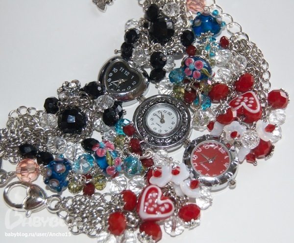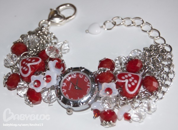 Часы выполнены из кварцевой часовой основы, бусин lampwork, гранёных бусин, , чешского стекла и фурнитуры под серебро.