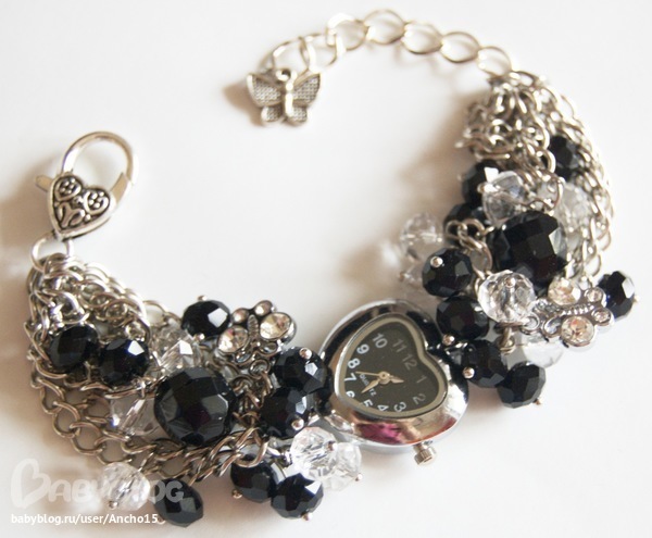 Часы выполнены из кварцевой часовой основы, бусин lampwork, подвесок со стразами, гранёных бусин, , чешского стекла и фурнитуры под серебро.