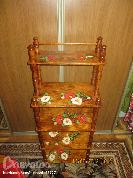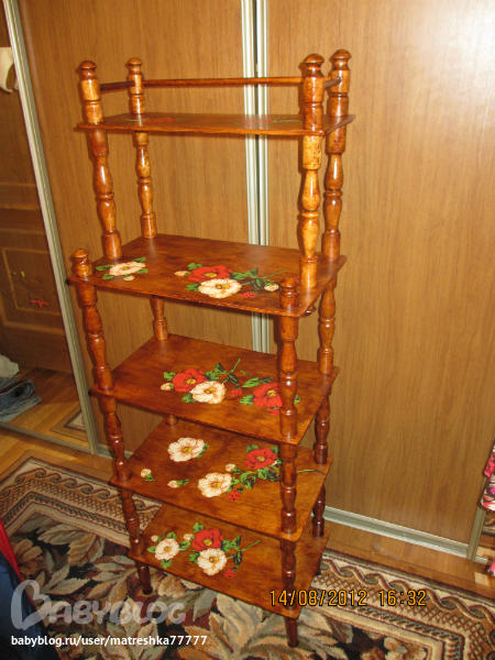 Работа с деревомЗавершила этажерочку давно,уже и не помню точно когда,но судя по фото 11-12.08:) Через пару дней она наконец-то приехала домой!:) Вот выкладываю,что получилось в итоге...