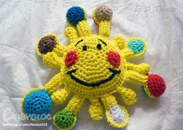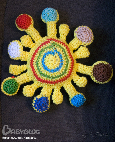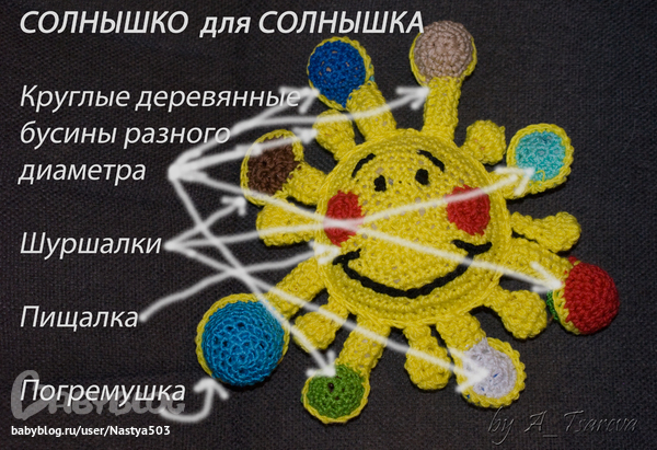 Внутри самого солнышка - пищалка. В некоторых цветных лучиках - круглые деревянные бусины. В которких лучиках (через один) - плоские деревянные бусины. В плоских цветных лучиках - шуршалки. В самом большом лучике - погремушка.