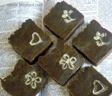 Это моё 2 ГС, ну и намучилась... Сначала оно расслоилось, я его снова взбила уже на бане...Потом оно убегало, кошмар!В составе кукуруза, подсолнух, рапс, горчица, касторка, кокос, оливка. В пережире - персик, репейное, кокос, миндаль. Шерсть 4%, деготь 4%. А теперь, девочки, я хочу критики - сделала сама штампы для мыла. Кого интересует - МК по ссылке. Вот смотрю, то нравится мне мыло со штампом, то не нравится, так часто у меня бывает - сомнения по поводу своих "творений". Покритикуйте! Ставить или нет такие штампы? А то, может, я мыло порчу, и лучше подождать закупку...