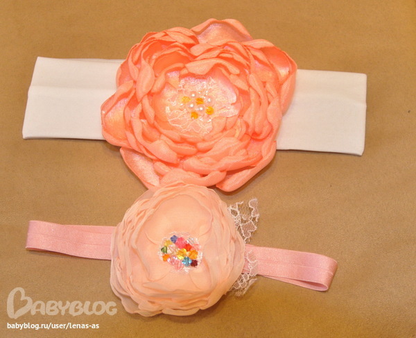 повязочки на голову..Светулька у нас мастерица,все так аккуратно и главное так здорово сделано))))кстати.с этими красивыми бусинами я у тебя тогда в посте увидела.так понравились,в живую они езе лучше))))))).На большой повязочке цветочек на липучке.отстегиается