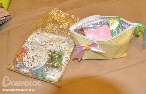 а это для моего рукоделия))))косметичку Светуля сама сшила)Как мне нравится такая расцветка,словно угадала светуль,обажаю горохи)))))))А в косметичке.....