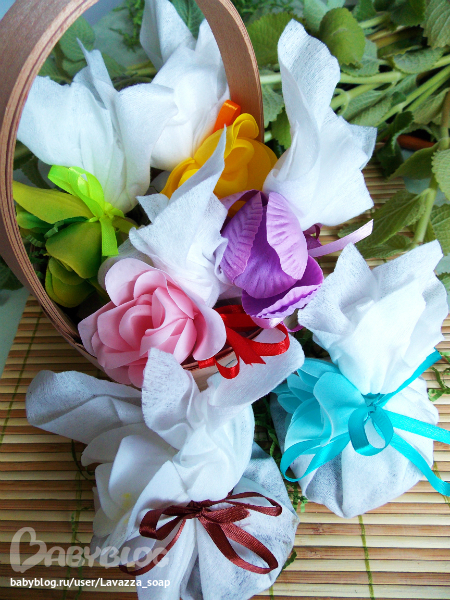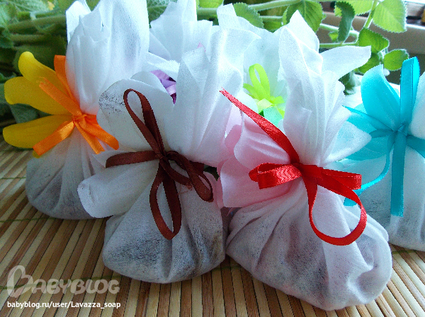 К каждому мешочку прилагается также мыльный цветок соответствующего цвета. Его также можно вспенивать и использовать по назначению)