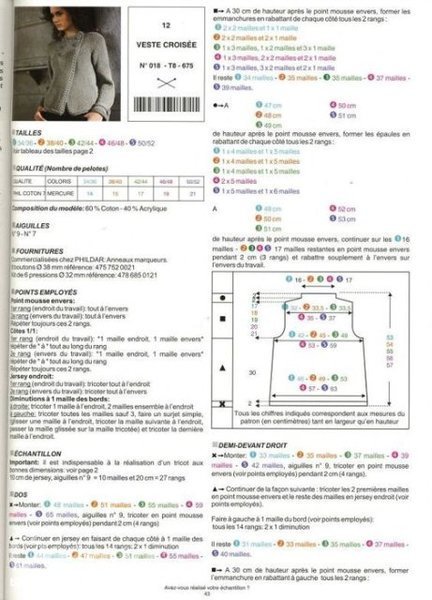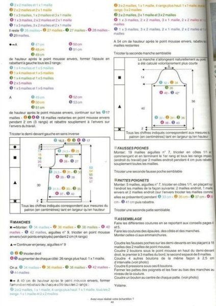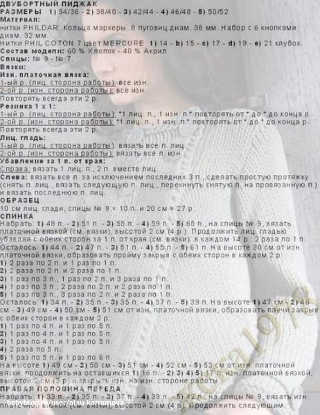 к сожалению это все , что я смогла найти. В принципе, тут обычные выкройки можно с любого пиджака, кофты, жакета взять. Я вот взяла у свекрови кофту, потому что она живет в другом городе и на примерки не наездишься. Вещь, с которой например будете вязать, должна быть комфортна в носке, то есть посадка пройм, длина, ширина. Ну ширину и длину можно варьировать. Я связала образец, постирала его, высушила и посчитала, сколько петель у меня в 10 см. То есть стандартная процедура. Померила, сколько у меня см в готовом изделии на которое ориентируюсь, прибавила еще по 1 см с обоих сторон, чтобы посвободнее было, , прибавила еще по 1 см с обоих сторон на швы, + 2 кромочные петли. У меня получилось в итоге 45+2+2см=49 см. + 2 петли на кромку. Вобщем 50 см в итоге я взяла. В 10 см у меня вышло 15 петель. Я набрала 75 петель.