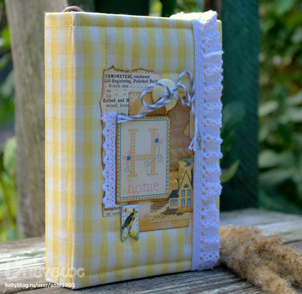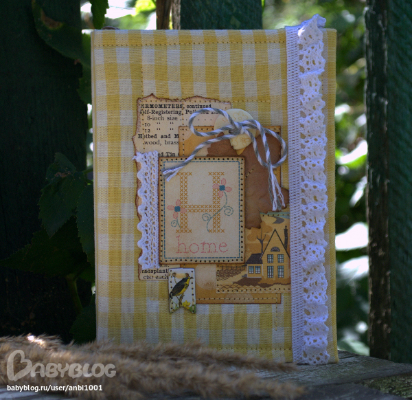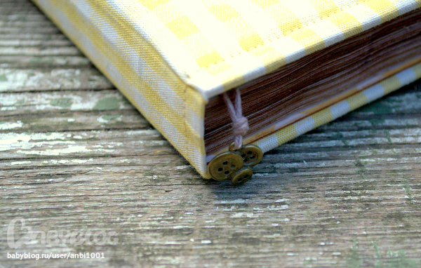 Выполнен полностью с нуля. Коптский переплёт, 300 состаренных страниц (150 листов), некоторые украшены штампиками. Обложка из хлопка. Закладка с подвеской "пуговки", закрывается на кружевную резинку.