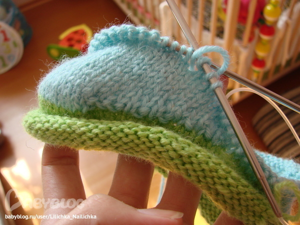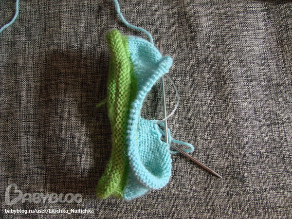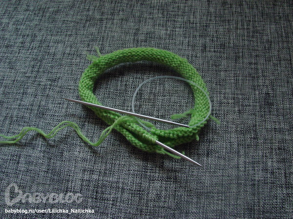 Нашли, прочитали, прикинули, подготовили материалы. Лично я чаще всего вяжу на спицах 3,5 - наиболее удачные при моей плотности вязания. Приготовила несколько мотков и остатков пряжи цветной, в тон комбезу, разумеется=) Связала образец, посчитала петли. При моей плотности вязания мне нужно не 90, как указано в схеме, а 80 петель. Это на богатыря 11 месяцев. Набрала 80 петель на кругое спицы, замкнула в круг. При этом следите, чтобы набранные петли не обернулись вокруг спицы, иначе получится лента Мобиуса, вязание пойдет восьмеркой, обжигалась много раз. (Потом отредактирую пост и вставлю фото ошибки, в этот раз уже проскочила это место). И по схеме вяжем 4 см.Как обычно, я даю маленькие совеы по ходу вязания.* Если длина спиц (проволки между ними) гораздо больше окружности головы, я делаю так: