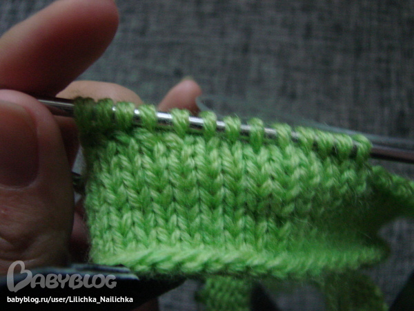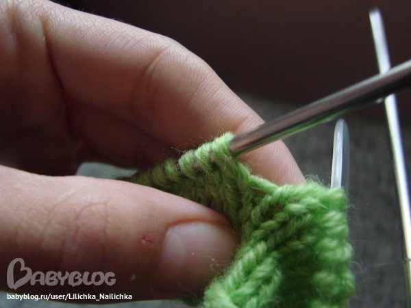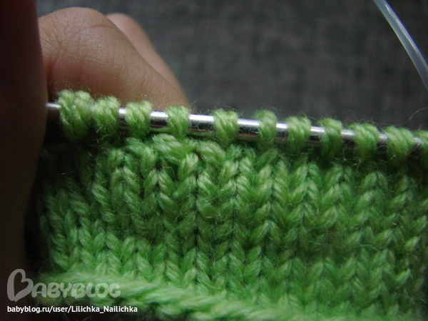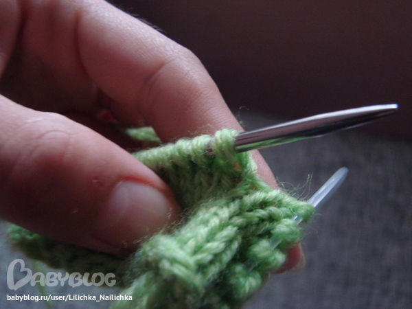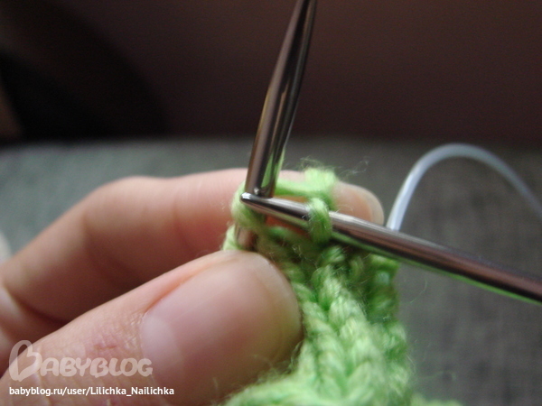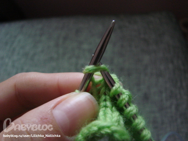 Продолжаем.Чтобы петли не получались скрещенными, нужно провязывать их за переднюю стенку. Вот так: