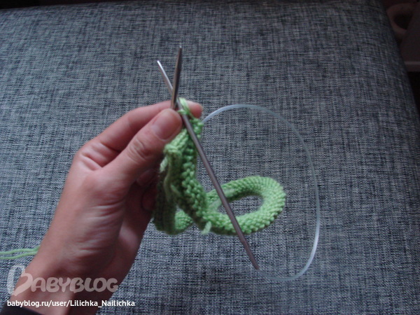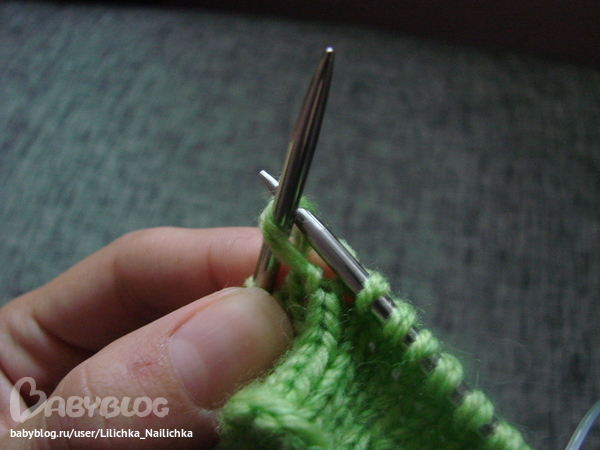 Вытягиваю правую спицу целиком, перенося все петли на левую спицу. Иначе она будет неподвижна. Провязываю несколько петель, пока хватает места на самой спице (не доходя до проволки), и опять вытягиваю правую. Надеюсь, понятно изъясняюсь=)* При вязании на круговых спицах мы вяжем только лицевые. Изнанка сама по себе получается=) НО! ПЕтли при этом получаются скрещенными. Сейчас на фото поймете.