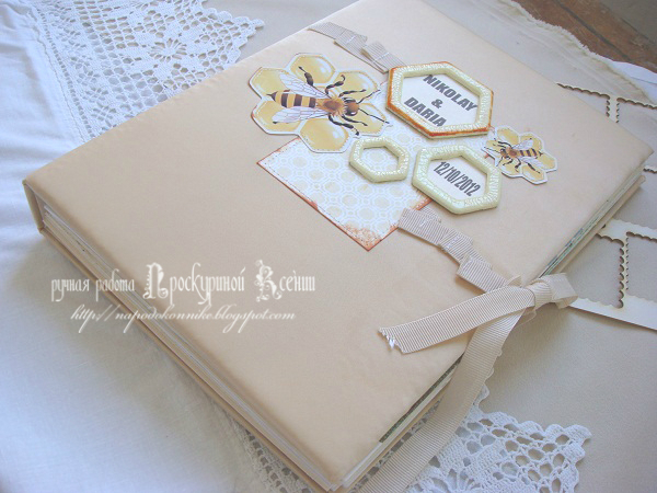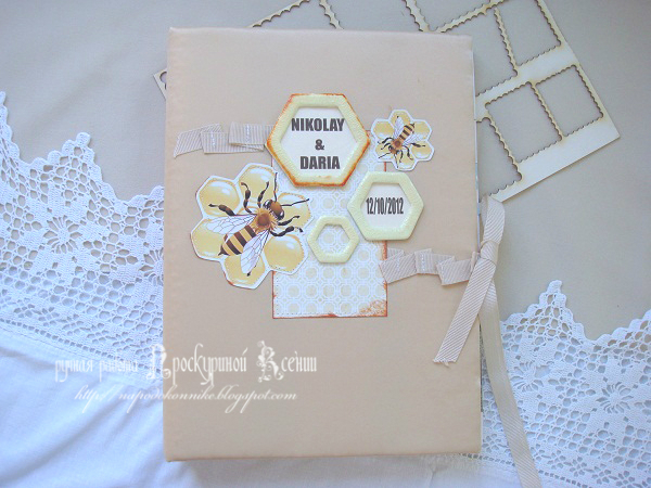 СкрапбукингНовенькая книга пожеланий на свадьбу. Тематика предстоящей свадьбы "Пчелы, мед". Получилась такая медовая книга с фотографиями счастливой пары.