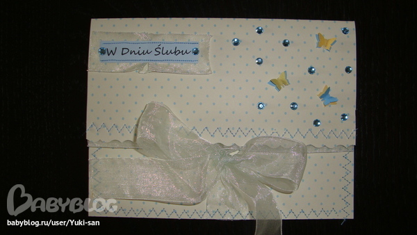 Пообрезайте лишние торчащие ниточки) И я бы бантик поменяла на двойную атласную ленту голубо-синих цветов) Этот как-то потерялся на открытки и смотрится небрежно, а в целом класс)