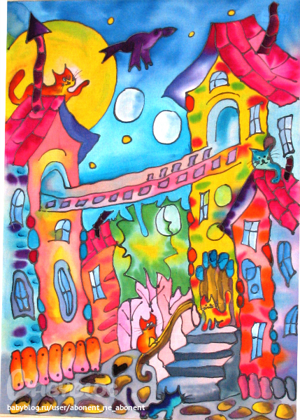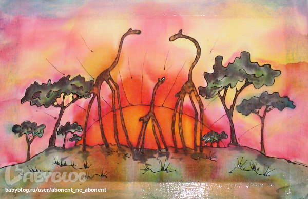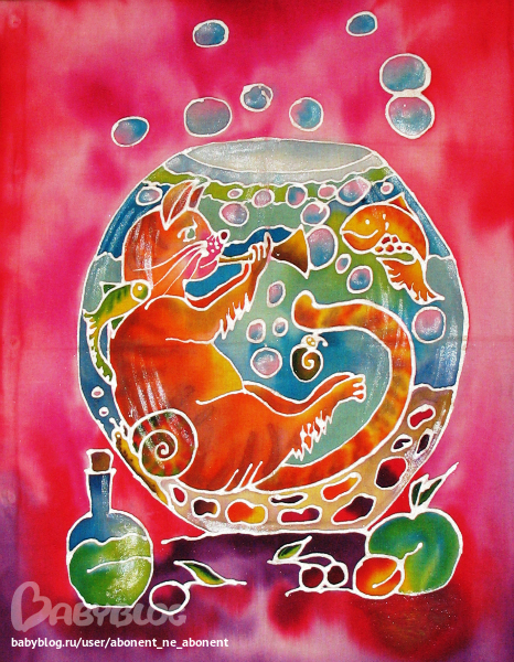 две последние просто офигенные!!!!! вы в меня прям желание за батик взяться вдохнули.У меня лежат краски для батика,думала ну когда-нибудь порисую,но думала только цветочки-бабочки рисуют ими....а меня не тянет особо на них,а после увиденных двух последних картинок пришло озарение ))))) оказывается и детскую тематику запросто можно изобразить.Спасибо-спасибо-спасибо!!!! очень понравились и вдохновили ваши работы!