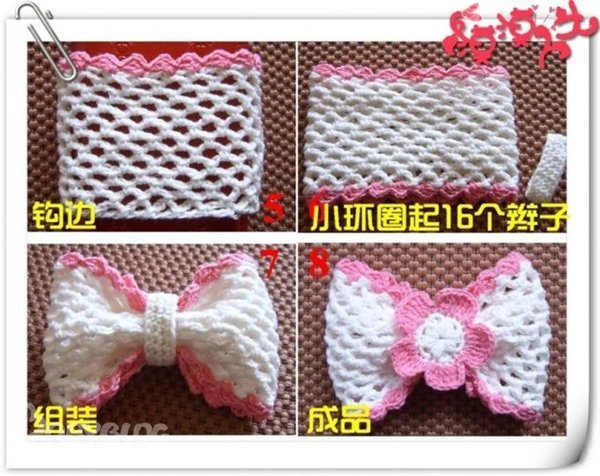 связать прямоугольник, потом небольшой полоской из сбн скрепить посередине,пришить цветочек. арочки лучше из 3 в.п. делать.