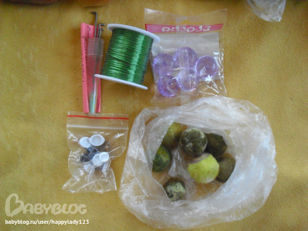 Иглы для валяния, леска-стреч, бусины, глазки для животинки и сваленые бусины! Кстати первый раз держу в руках валяное изделие!