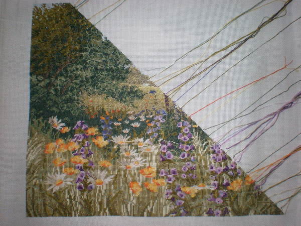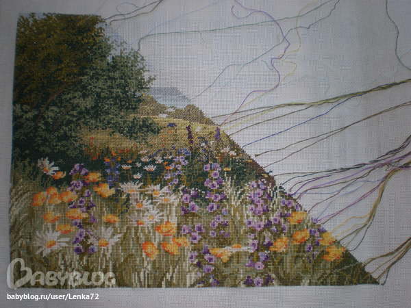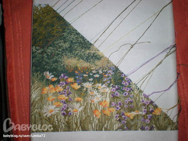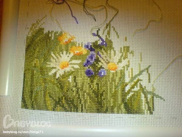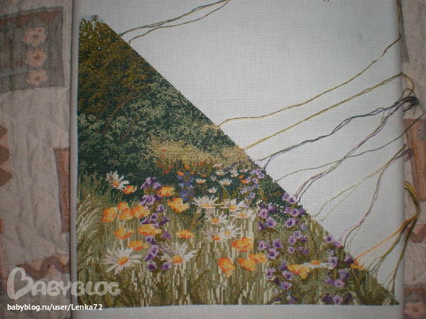 Похоже, что я первая со своим маленьким отчетиком. Почти не заметно, что я навышивала. Все трава,трава....Мелкий мне за выходные совсем не дал сесть за вышивку. Сейчас уложила и сяду вышивать....