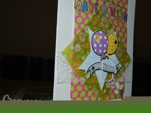 Для начала очень достойная работа! Чувствуется идея - если позволите, мне кажется, что этот полупрозрачный ромб с цветочками не совсем гармонирует с нежным кружевом и пастельной голубой звездочкой и шариками в горошек. Успехов в нашем нелегком деле!