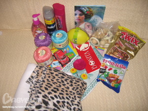 тут кусочек детям (машинака и раскраски), сладости МНЕ))) открытка с теплыми словами, и вкусно пахнущие гели для душа мне и Миланке. И про папу нашего Наташа не забыла)