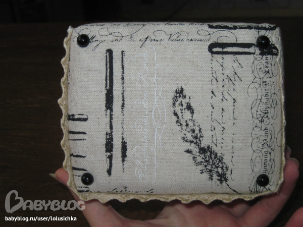 1)Делала по заказу одноклассницы (коробку от фотика обклеила виниловыми обоями, у меня тогда вообще ничего не было и слово скарпбукинг я выговаривала с трудом):