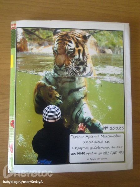 просто сделала на компьютере обложку, подобрав картинку и вставив табличку, отнесла распечатать на фотобумаге, проклеила с внутренней стооны верхнюю обложку белой бумагой, на которой указала сведения о ребенке и сведения о матери, лист , приклееный изнутри загнула на лицевую сторону обложки, т.к. край был обтрепан. сверхну наклеила распечатанную обложку, проклеила ее по периметру узким скотчем, чтобы не отклеилась, корешок тетради и ее края тоже проклеила узким скотчем, так как уже начали трепаться. приклеила желтый квадратик на корешок для себя, чтобы среди множества карточек можно было легко увидеть свою.