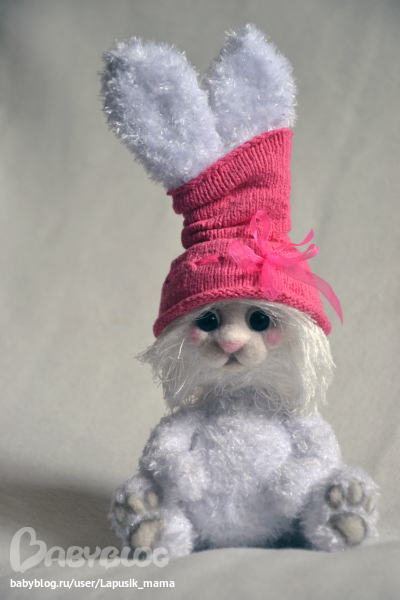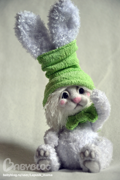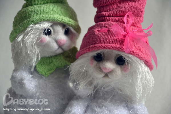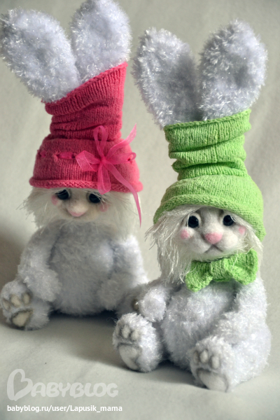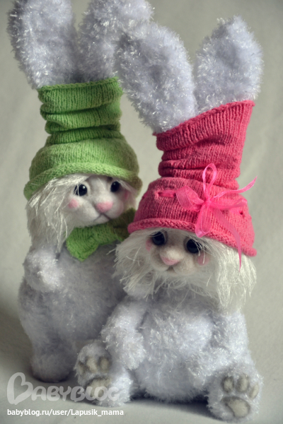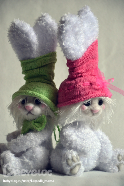 Связаны из пряжи двух видов, мордахи и пяточки привалены, в пузиках гранулят,лапки на шплинтах, шапочки снимаются. Рост 18 см без ушей.