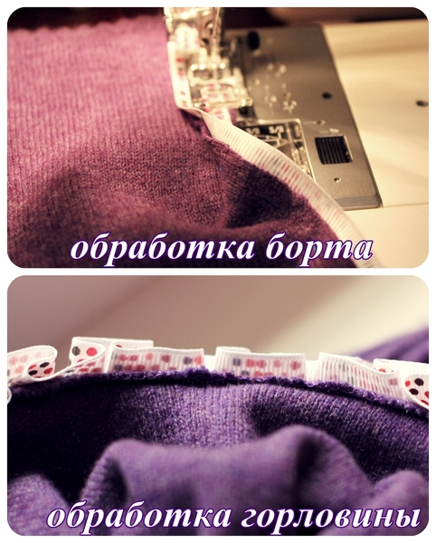 горловину предварительно обметала на узком оверлоке,тк второй край тесьмы не настрочен.