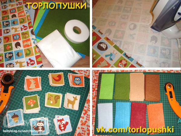 1. Вам понадобиться ткань с повторяющимися рисунками животных, растений, цветов, игрушек, и т.п., это необязательно должна быть одна ткань как у меня, можно использовать различные ткани из одной собачку, из другой цветочек вырезать и т.д.; Фетр жесткий толщиной 1мм; флизелин; швейная машинка, нитки, ножницы, утюг ( у меня на фото есть еще паутинка, но в процессе работы я отказалась от ее использования)
