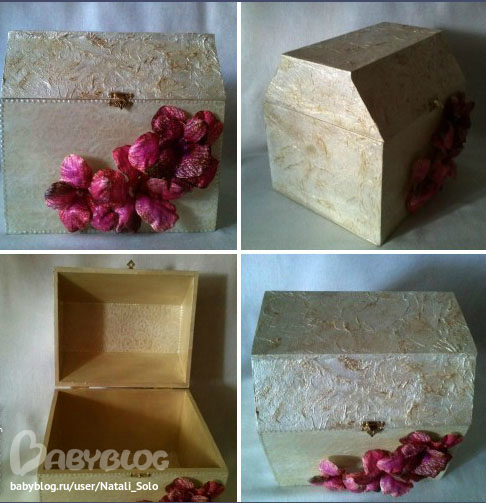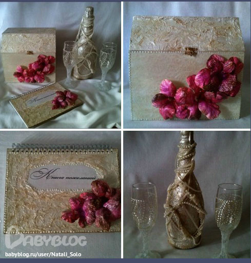 ДекупажКак-то так повелось с самого начала, что мне больше заказывают комплектами:) Вот и свадебный заказ не стал исключением:) Заказчице хотелось, чтобы были цветы, бусины и все переливалось. А так же фото в книге и памятная надпись. Собственно все и было исполнено:) Сундучок для поздравительных конвертов сдела из деревянный заготовки (чаще делают из старых кортонных коробок) и в дальнейшем его можно использовать для хранения украшений или памятных вещиц. И жених и невеста остались очень довольны, а это главное:)))